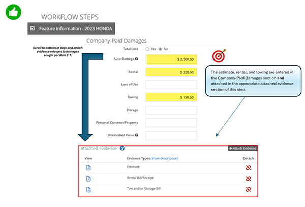 When the responding company does not properly attach evidence to the Feature Response workflow step to support its damage dispute (i.e., evidence is attached to liability arguments) and this is raised by the recovering company, the evidence will not be considered by the arbitrator (Rule 2-5).